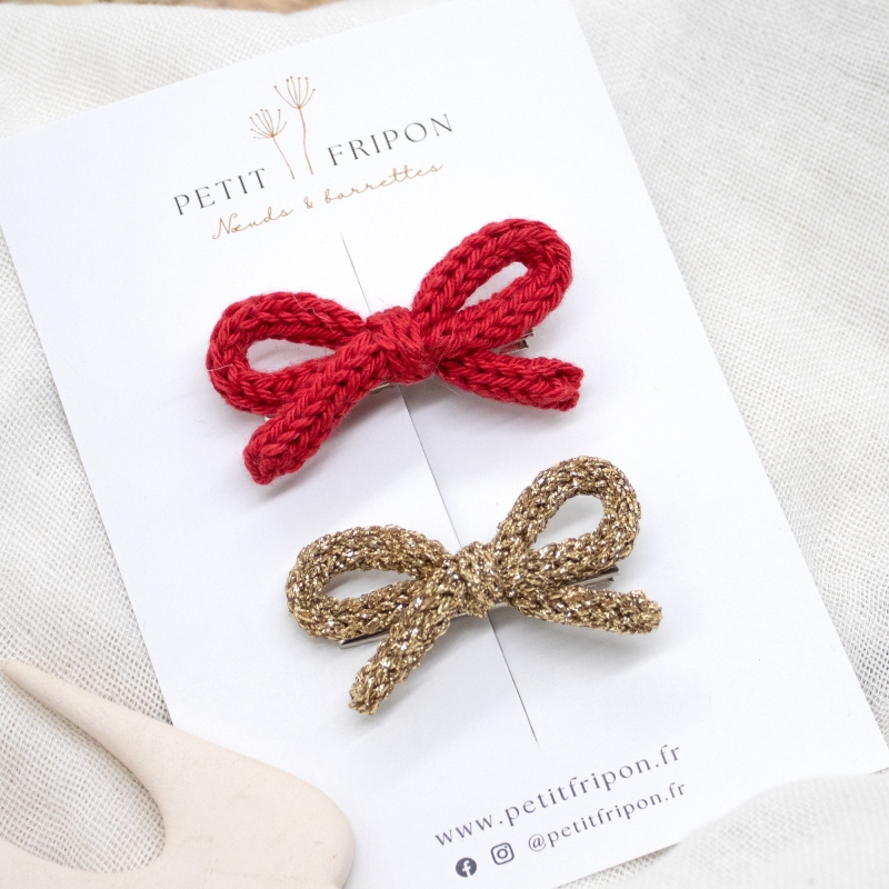 Le nœud rouge en tricot apporte chaleur et douceur, tandis que le nœud doré scintille de mille reflets pour une touche de fête.