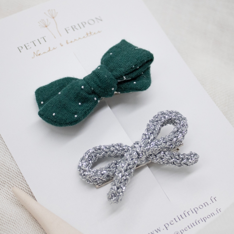 Le nœud vert étoilé évoque la magie de Noël, tandis que le nœud argenté brille tel un éclat d’hiver.