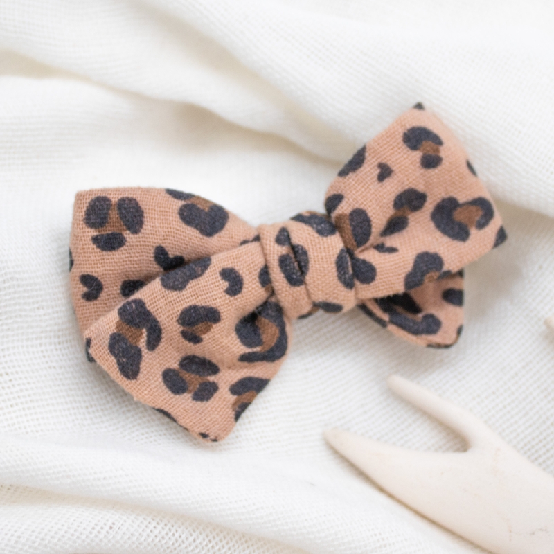Apportez une touche chic et tendance à la coiffure de votre enfant avec ce nœud motif léopard caramel sur pince croco, confectionné à la main avec soin.