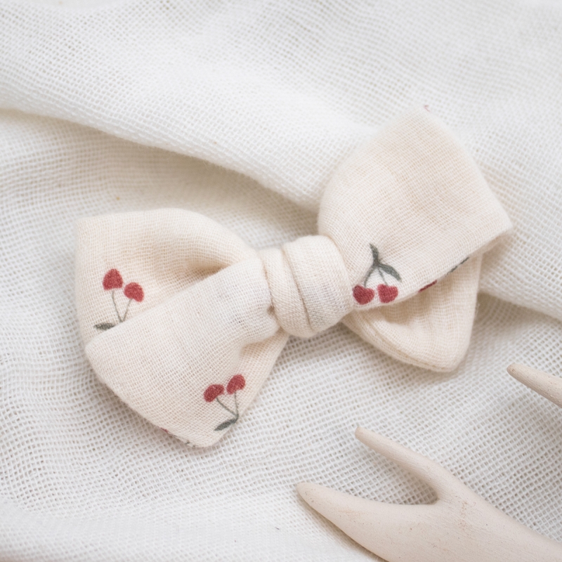 Ajoutez une touche tendre et raffinée à la coiffure de votre enfant avec ce nœud écru motif cerises sur pince croco, confectionné à la main avec soin.
