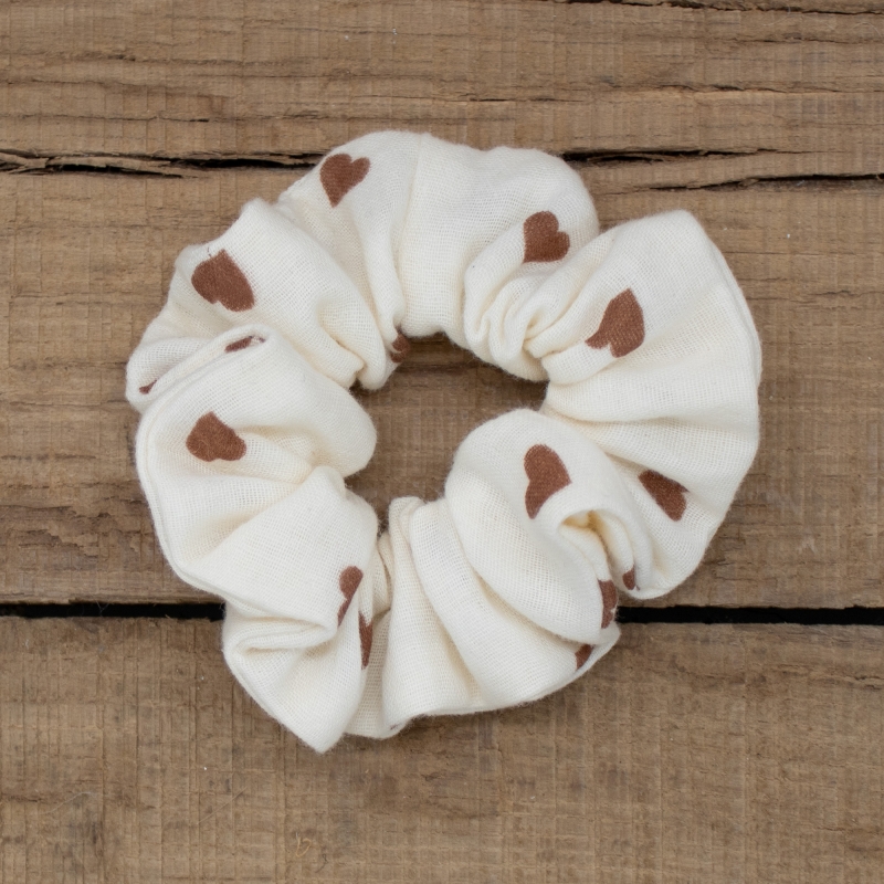 Apportez une touche tendre et chaleureuse à vos coiffures avec ce chouchou écru à cœurs marron. Son imprimé délicat et ses tons naturels en font un accessoire intemporel, parfait pour toutes les saisons.